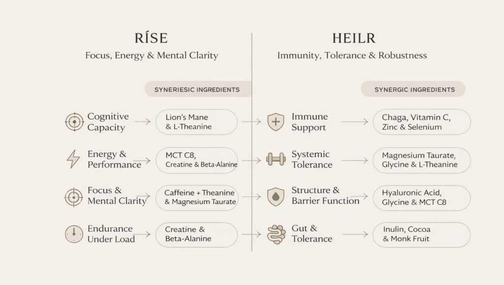RÍSE er bygget for prestativ klarhet: evnen til å tenke skarpt, jobbe lenge og holde trykk – uten den klassiske overstimuleringen.